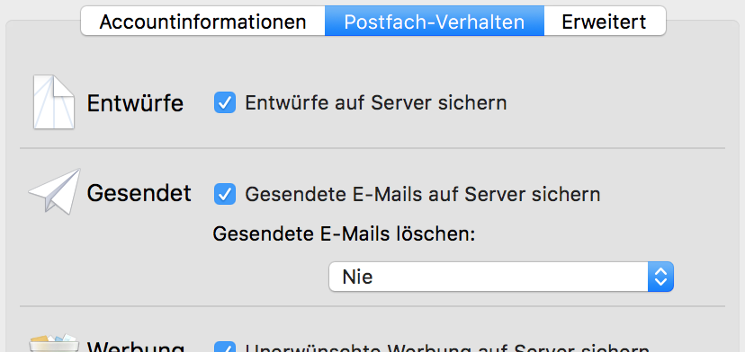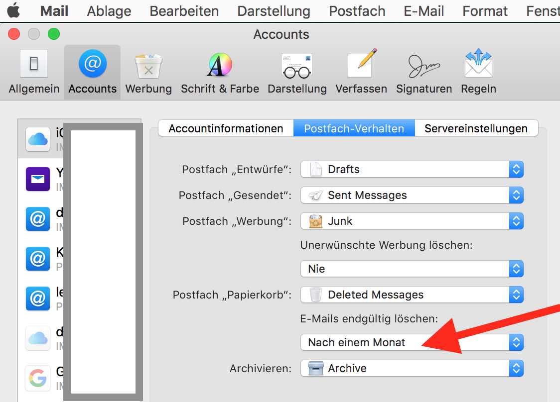 Das Mail Programm von Apple löscht automatisch nach 2 Tagen gesendete Nachrichten. Empfangene Nachrichten bleiben gespeichert. Wie kann ich die Einstellungen hierfür ändern und wo finde ich sie (gesendete Nachrichten sollen gespeichert bleiben). Danke für eure Antwort.