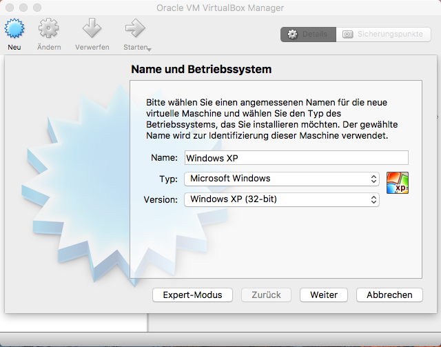 Als Typ wählst du "Microsoft Windows" aus und als Version "Microsoft XP (32-bit) und bestätigst das ganze mit weiter.