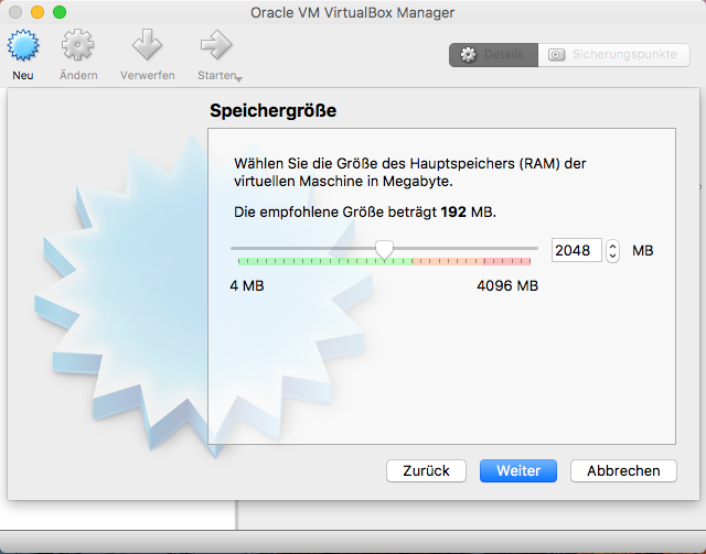 Je nachdem wieviel in deinem Mac an Arbeitsspeicher verbaut ist, weist du der virtuellen Windows Maschine einen bestimmten teil zu. Selten wird mehr als 2GB benötigt, mehr als 3,8GB sind nicht notwendig. Beachte aber bitte, dass der Arbeitsspeicher hier bereits beim Starten der virtuellen Maschine zugewiesen wird und dadurch das macOS langsamer werden kann wenn du nicht ausreichend Speicher verbaut hast.