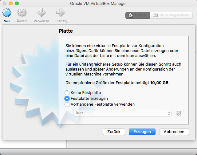Hier kommt nun der empfohlene Speicherplatz zum Einsatz. Benötigst du mehr Speicherplatz, so kannst du dies hier mit dem Schieberegler ändern, oder in dem rechts davon vorhandenem Eingabefeld einen belibigen Wert eingeben. Achte darauf, dass du auch theoretisch mehr Speicherplatz eingeben kannst als du noch auf deinem Mac momentan frei hast. Dies kann aber mit der Zeit zu ernsthaften Speicherplatzproblemen unter macOS führen. Bestätige das Fenster mit "Erzeugen". Dabei werden beide Fenster sich schließen und du siehst nur noch den VirtualBox Manager mit deiner gerade angelegten virtuellen Maschine.