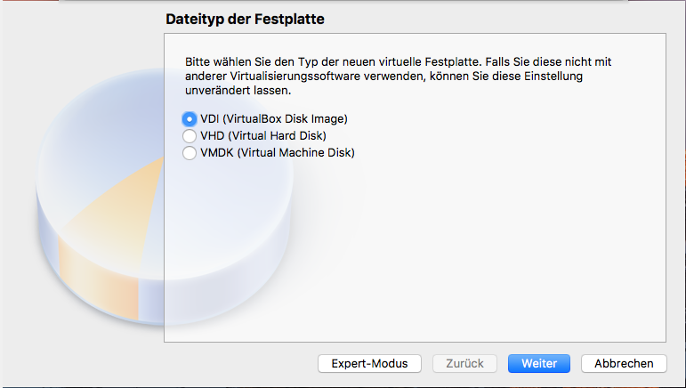 Es öffnet sich nun ein drittes Fenster in welchem du den Dateityp der Festplatte bestimmen kannst. Hier ist der Standard "VDI (VirtualBox Disk Image) für deine Zwecke ausreichend. Bestätige das ganze mit "weiter".