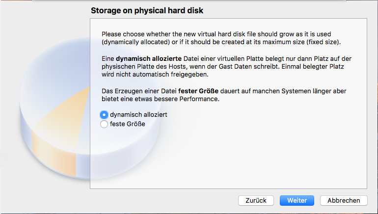 Damit dir in macOS die Festplatte nicht sofort die vollen 10 GB an Speicherplatz belegt, sondern nur diesen welcher auch tatsächlich von der virtuellen Maschine verwendet wird, lässt du die Einstellung auf "dynamisch alloziert" und klickst auf "weiter".