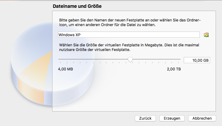 Der nächste Schritt ist es nun eine virtuelle Festplatte für Windows zu erstellen. Je nachdem wieviel Speicherplatz deine Programme und Daten benötigen kannst du den empfohlenen Wert von 10 GB beibelassen. Klicke nun auf "Erzeugen" um in den Assistenten für die Erstellung der virtuellen Festplatte zu gelanden.