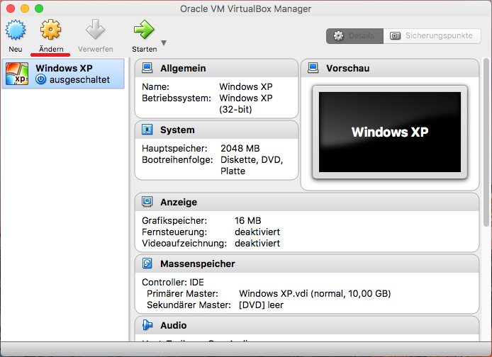 Nun kannst du deine neue Windows XP Maschine durch einen Klick auf den grünen Pfeil "Starten" einschalten und mit der Installation von Windows XP beginnen.