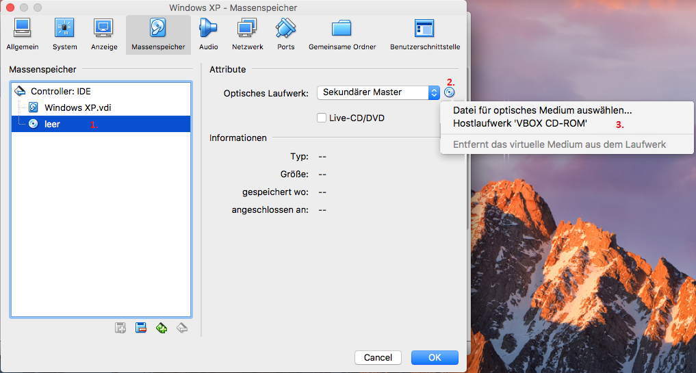 Lege nun die Windows Installation CD in das interne SuperDrive oder USB SuperDrive. Klicke in der linken Seitenleiste auf das CD-Symbol mit der Beschriftung "leer", so dass dieser Eintrag blau hinterlegt ist. Rechts oben findest du nun das identische CD Symbol. Nach einem Klick auf das Symbol kommt ein auswahlfeld, wo du entweder eine lokale ISO (1. Punkt) oder das Hostlaufwerk (2. Punkt) auswählen kannst. Wähle "Hostlaufwerk" aus.