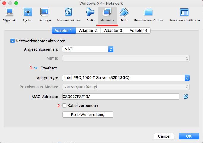Jetzt kommt eine dringende Empfehlung von mir. Weise der virtuellen Maschine keinen aktiven Netzwerkadapter zu und versuche möglichst ohne Internetverbindung die Maschine zu betreiben. Ist für das von dir verwendete Programm eine Internetverbindung erforderlich, so schalte diese nach bedarf ein und ab. Klicke dazu auf "Netzwerk" und auf den kleinen blauen Pfeil. Entferne den Haken bei "Kabel verbunden" um die Internetverbindung zu trennen. Später kannst du im Betrieb das virtuelle Kabel nach belieben in der unteren rechten Ecke der laufenden Maschine an und abklemmen. Bestätige das Fenster mit "OK"