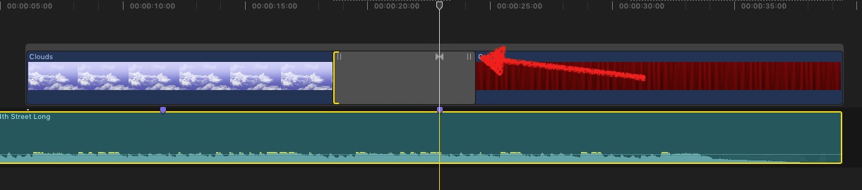 Wenn ich die gesamte Blende einfach absolut nach links dorthin ziehe wo sie beginnen soll, müsste ich sie ja nach rechts verlängern, damit sie an der Stelle endet, an der ich sie laut Musikschnitt haben möchte. Aber auch dass gelingt natürlich nicht, weil sie beim Verlängern immer in beide Richtungen (symmetrisch) gedehnt wird.