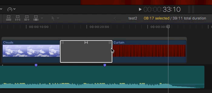 Und dann lege ich an der gewünschten Stelle zwischen den beiden Clips mit cmd+T eine Standardblende an, die ich manuell auf die zuvor ermittelte Zeit einstelle. Dieses Blendenfenster kann man dann ja mit dem Positionswerkzeug komplett zwischen die beiden Marker schieben.