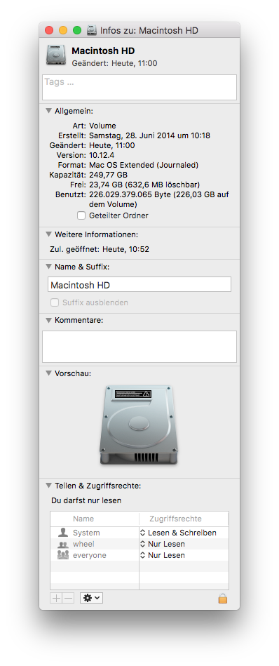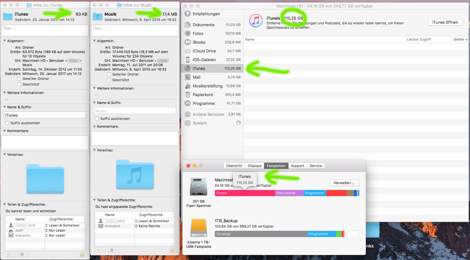 Hallo, hab auch das besagte Problem mit Itunes und dem Auslagern der Mediathek, auch unter Verwendung von Tools hat sich dabei nichts geändert. Da ich nicht eine Datei in ITunes habe, werden weiter 250GB ausgegeben. Es lässt sich bei mir auch nicht eine einzige große Datei identifizieren, so hilft mir das Tool aktuell auch wenig. Das Problem tritt auch erst seit Sierra auf, denn ich habs auch einfach mal mit der letzten Version probiert, aber aus einem Backup bekomm ich immer eine volle Platte, auf einem älteren Mac gibt es keine Probleme unter El Capitan.