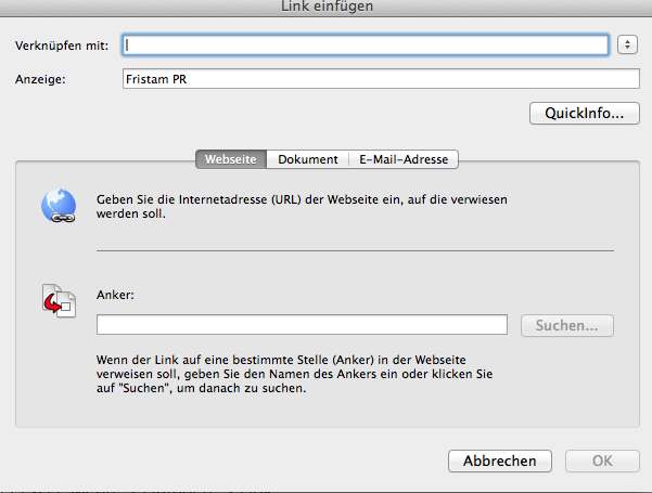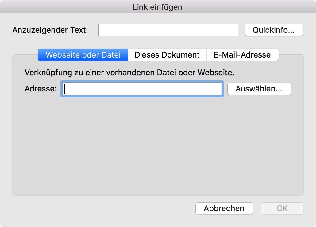 ich versuche auf meinem MAC, Version 10.9.5 sowohl in Word wie in Excel PDF-Dateien zu verlinken. Dazu habe ich unter "Verknüpfen mit Dokument" die entsprechende PDF-Datei angeklickt. Es erscheint der Link im Word- bzw. Excel-Dokument. Beim Anklicken kommt aber die Fehlermeldung "Die angegebene Datei konnte nicht geöffnet werden."