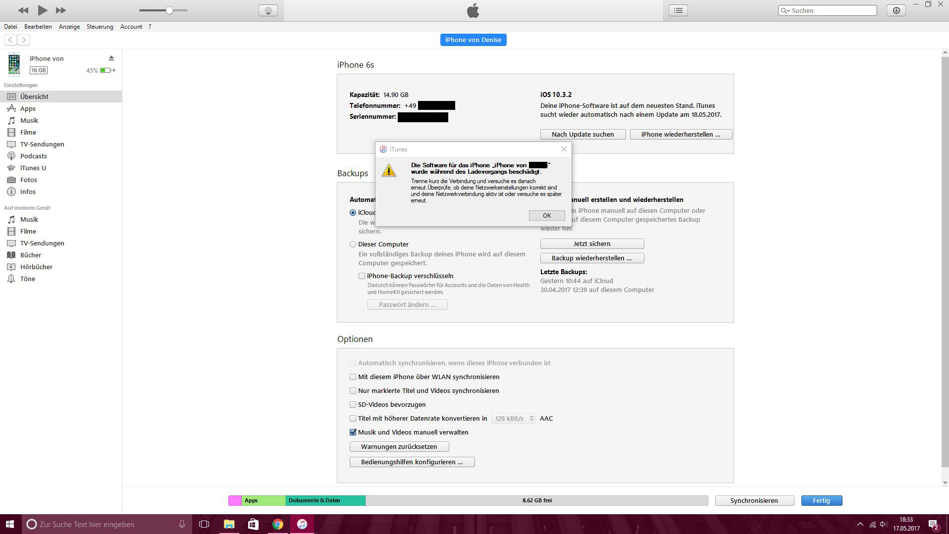 Nun dachte ich, dass vielleicht eine Wiederherstellung des iPhone das Problem behebt, worauf hin ich aber auf das nächste Problem gestoßen bin. Bevor das Gerät wiederhergestellt wird, wird die aktuelle iOS-Version ja aus dem iTunes-Store geladen. Jedes Mal wenn der Ladevorgang abgeschlossen ist, bekomme ich aber den Fehlercode 1403. Folgendes wird mir angezeigt: