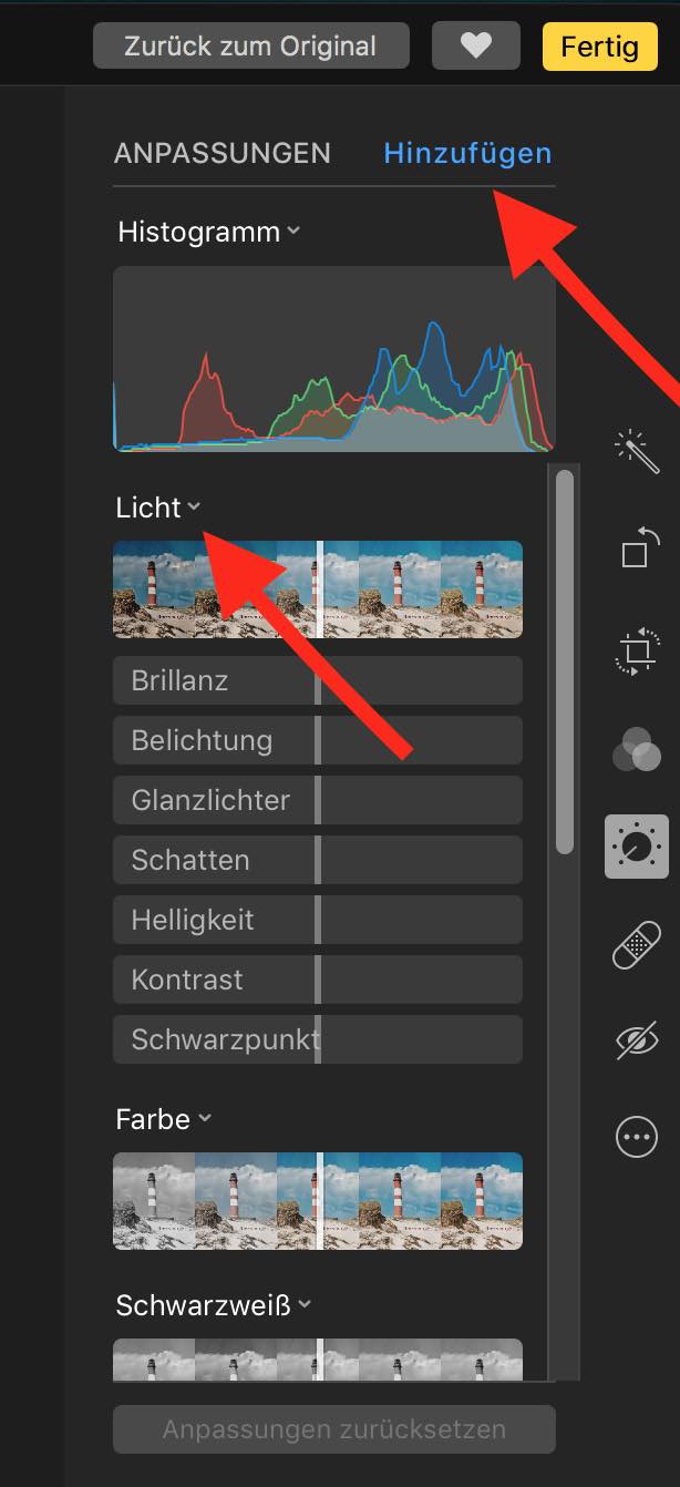 Fotos kann immerhin mehr als iPhoto - hast Du alle Anpassungen gefunden? Viele müssen erst hinzugefügt werden, um die fortgeschrittenen Anpassungen zu sehen. Im Edit Dialog > Anpassungen ist ganz oben rechts nahezu unsichtbar in blau auf schwarz "Hinzufügen". Da wähle weitere Anpassungen aus, wie Histogram. Für die meisten Anpassungen gibt es zusätzliche Option, wenn man den Abwärtspfeil neben dem Namen klickt. Das "Ausrichtenwerkzeug, um den Horizont gerade zu rücken, ist mit dem Beschneidewerkzeug kombiniert.