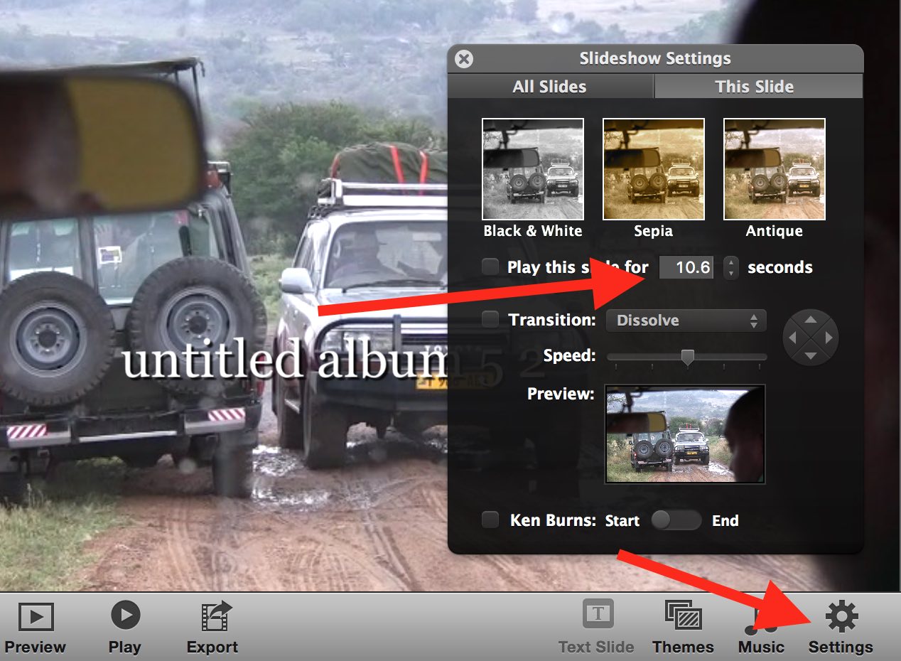 In iPhoto '11 klicke die Diaschau Einstellungen. Der zweite Reiter mit den Einstellungen für "Dieses Foto" hat ein Feld, wo für jedes gewählte Foto individuell die Standzeit eingestellt werden kann. Es hängt vom Thema ab, dieses möglich ist. Für die Themen "Classic" und "Ken Burns" kann man die Einstellungen für individuelle Fotos variieren, für die komplexeren, neueren Themen mit mehr als einem Foto auf jeder Folie geht das nicht.