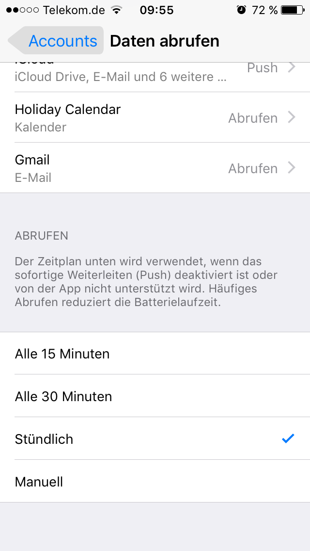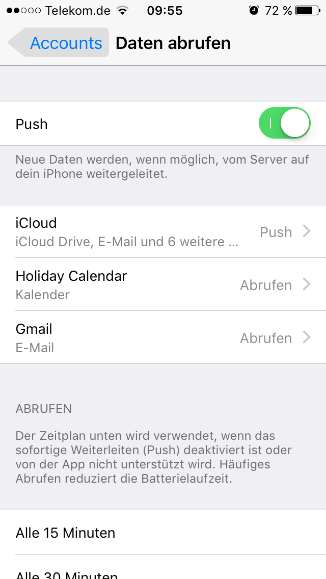 Jedoch ist sas so nicht korrekt. Man kann auch bei GMail den Push aktivieren! Hab auch den Abruf nach 30 Minuten getestet sowie mittlerweile das iCloud Konto die ebenfalls nicht funktionieren! Ich denke, es ist keine Sache der Einstellungen.