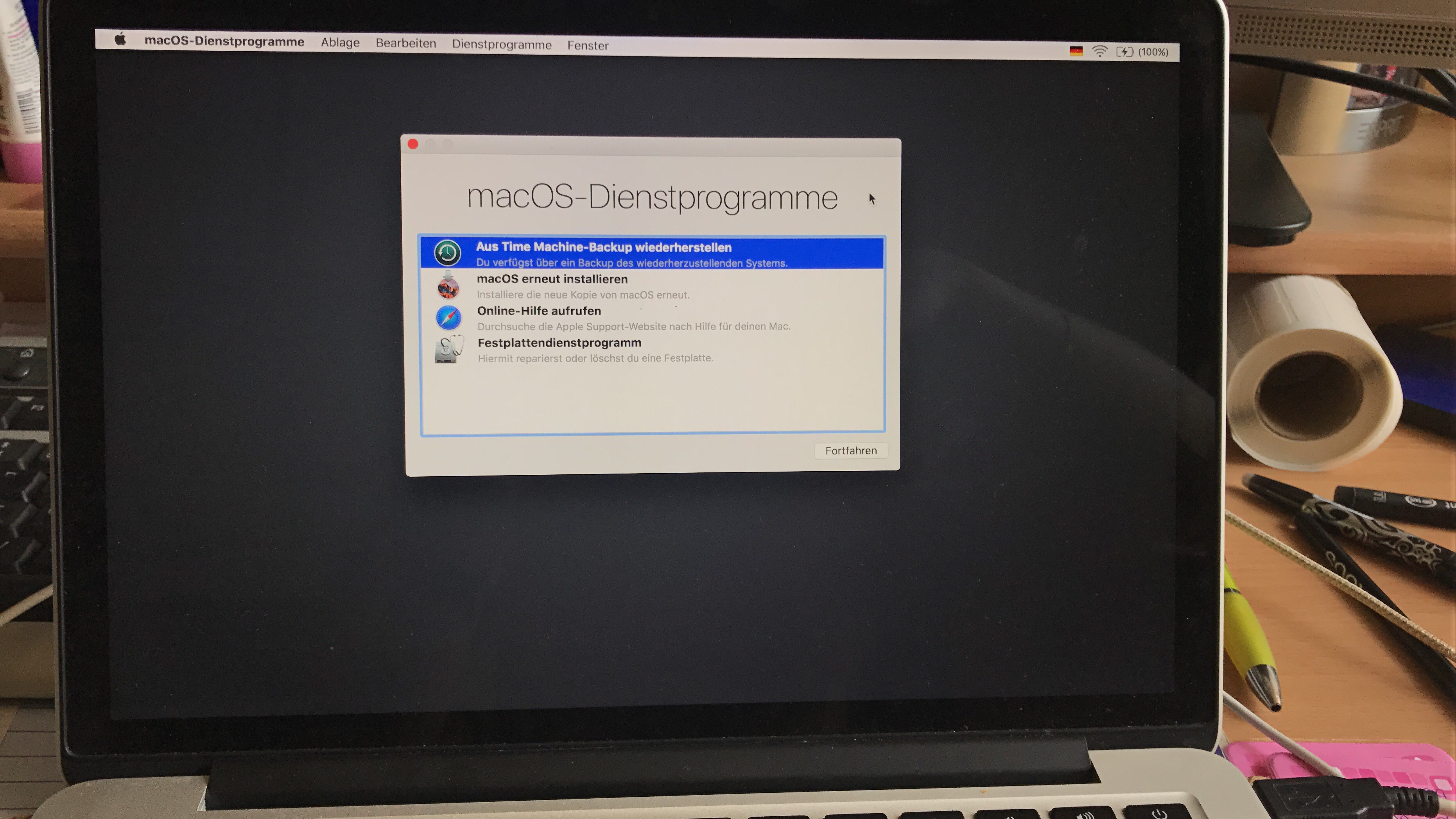 Nach Abschluss der Installation sollte der Mac vom USB-Stick starten, falls nicht muss er über das Festplattendienstprogramm noch als Startmedium festgelegt werden. Spätestens jetzt sollte der Mac vom USB-Stick booten und man kann seine Daten sichern.