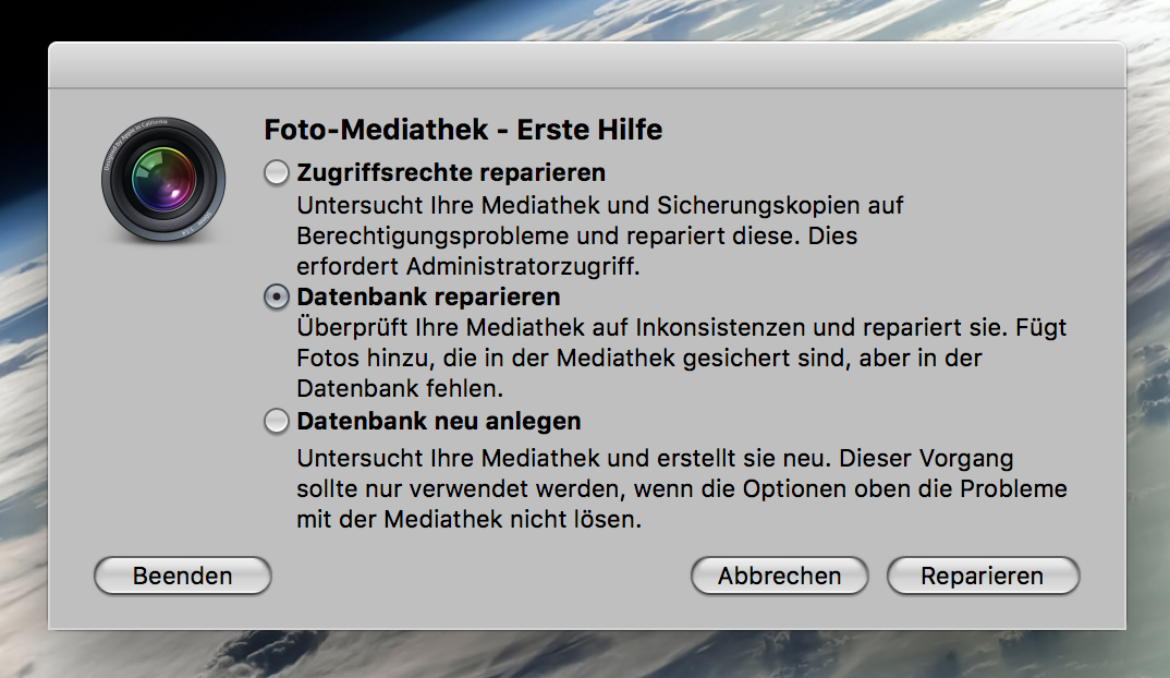 Ich arbeite an einem "MacBook Pro (Retina 13 Zoll, Anfang 2015)" unter Sierra (10.12.5 (16F73)). Die Aperture-Mediathek (341,18 GB) befindet sich auf einer externen Festplatte, auf der genügend Speicherplatz (noch etwa 640 GB) zur Verfügung steht. Ich habe die Mediathek bereits von Aperture neu anlegen lassen und auch alle anderen Schritte (Zugriffsrechte reparieren und Datenbank reparieren) zuvor bereits probiert gehabt.