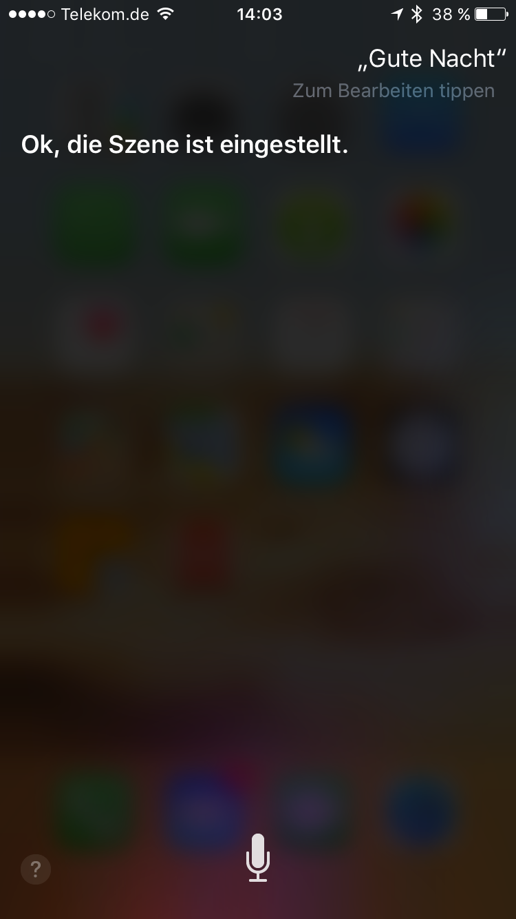 Hallo zusammen, ich weiß nicht warum, aber Siri ist nicht in der Lage die Stabdardszene "Gute Nacht" auszuführen.