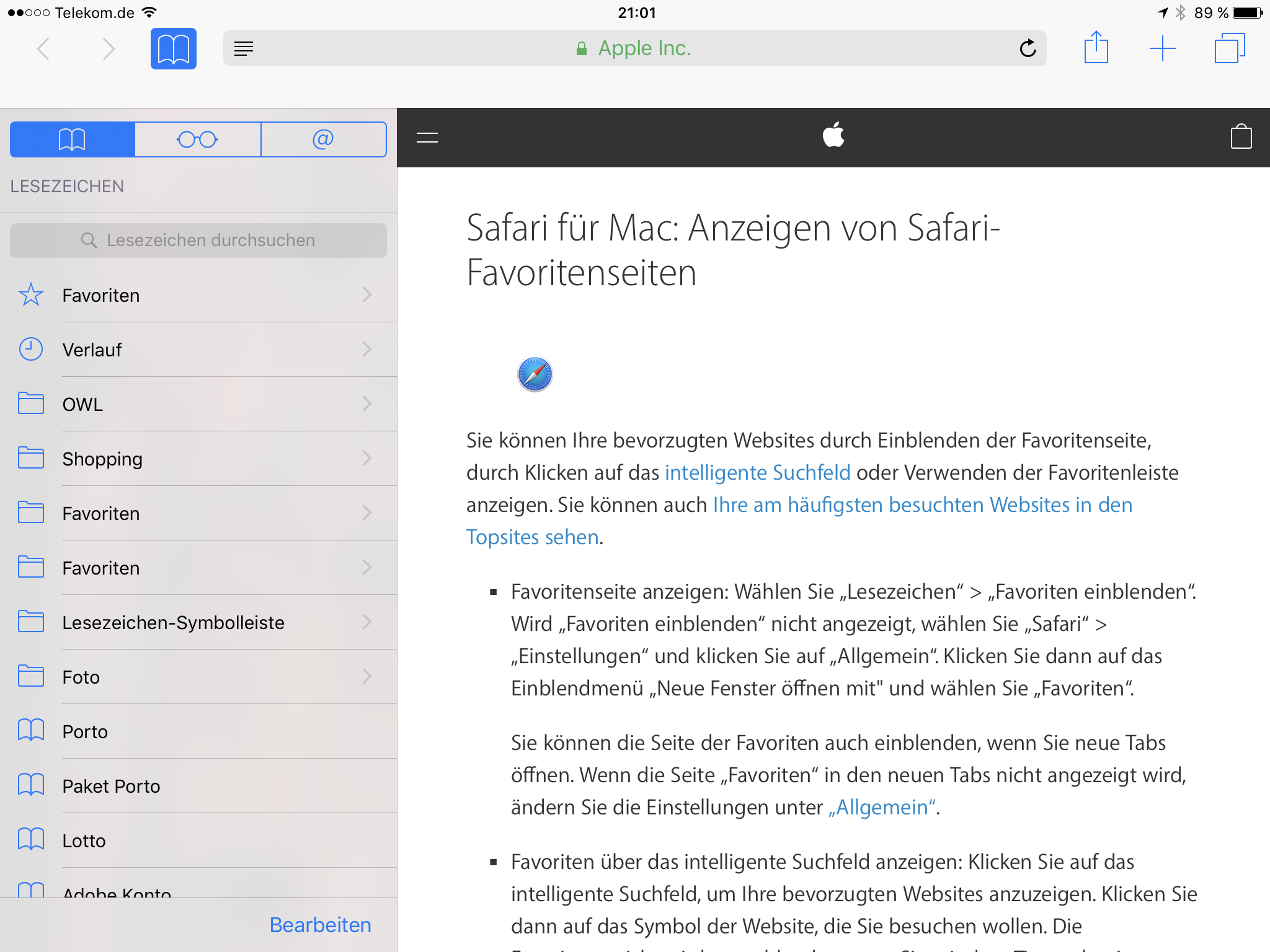 Meine Favoritenleiste unterhalb des Adressfeldes ist leer. Aber nur auf dem IPad, auf dem Mac ist alles normal. Wenn ich auf das Buchsymbol klicke werden mir die Lesezeichen angezeigt. Hier finde ich dann 3 Ordner Favoriten (2 leer in einem sind die Favoriten) und einmal Lesezeichen Symbolleiste (Favoriten auch hier vorhanden)