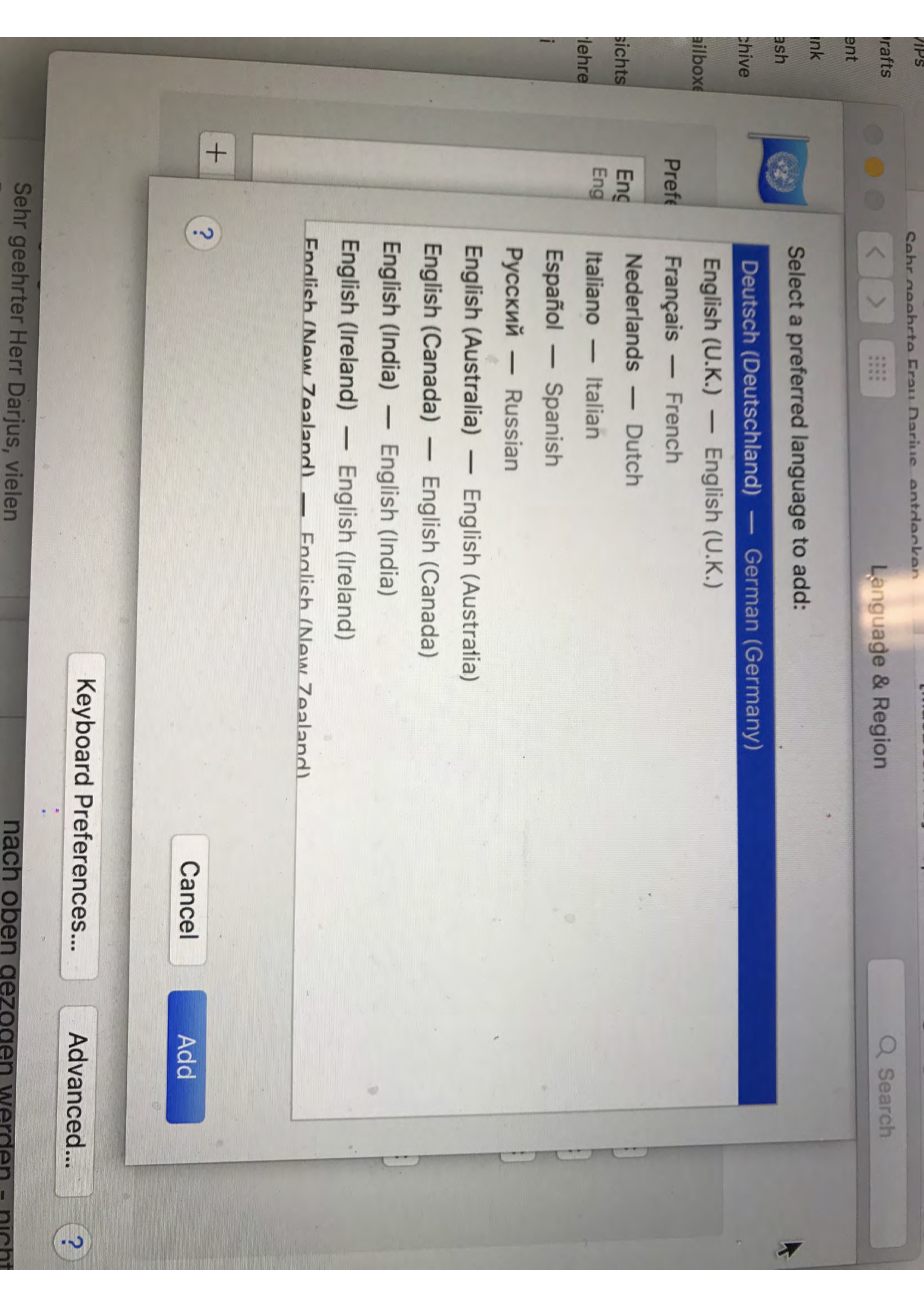 Mein MacBook Pro hat sich über Nacht auf englisch umgestellt. Alle Versuche der Rückstellung (Systemeinstellung und Terminal) haben nicht geholfen. Ich brauche dringend einen Tipp!