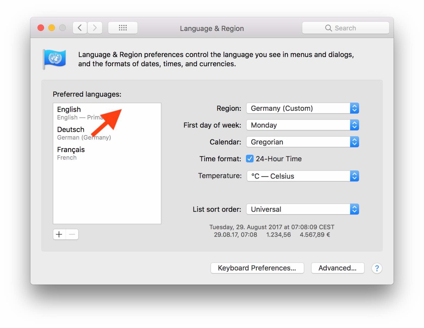 Hier wurden schon mal diverse Hinweise zur Umstellung geschrieben: Re: Bei meinem MacBook Pro lässt sich die Systemsprache nicht mehr ändern!