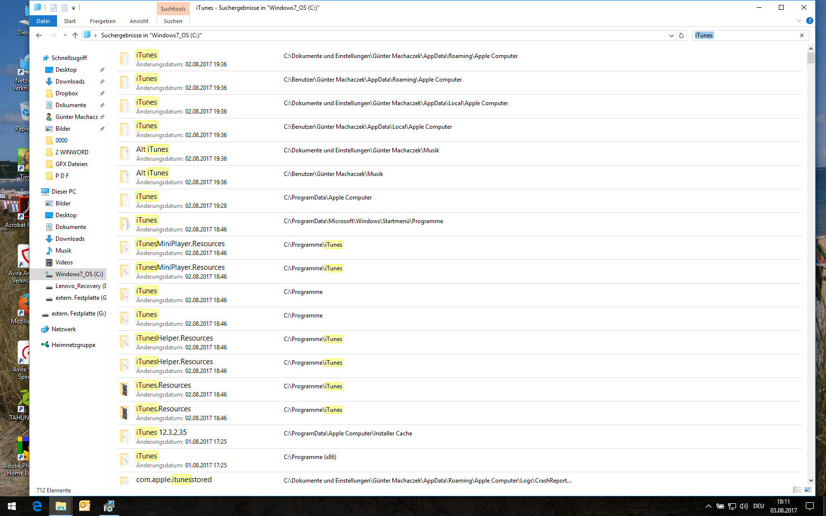 Danach würde ich nun nochmals nach iTunes auf dem PC suchen. Wenn die Suche noch Reste zeigt, ist zu überlegen, ob du sie nicht manuell löschst. Das sollte bei AppData m.E. keine Probleme verursachen, die Daten kommen bei Neuinstallation wieder zurück.