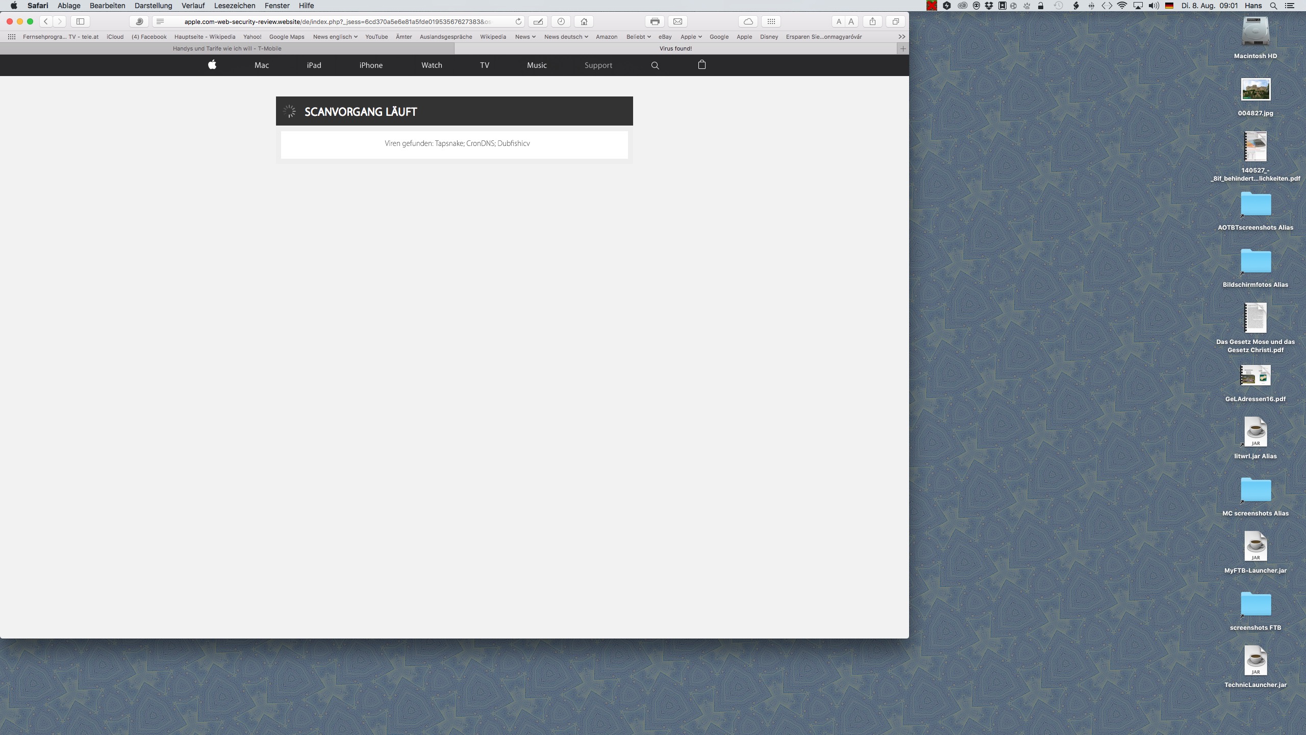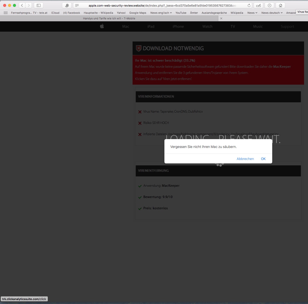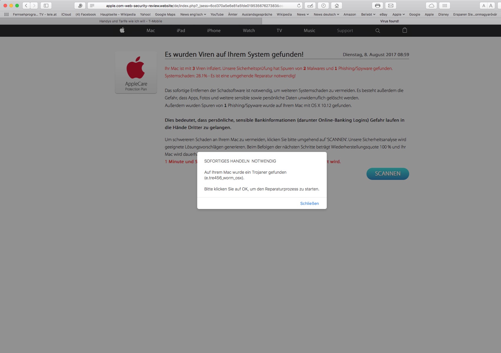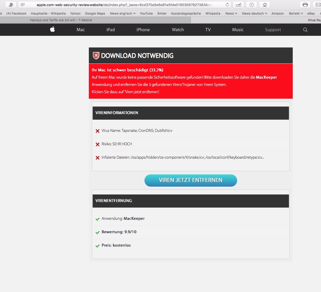 Folgendes ist mir passiert. Ich öffnete Safari und wurde gleich informiert, dass auf meinem Rechner Viren gefunden wurde und ich das Problem beheben sollte. Die Nachricht war so verfasst, dass man meinen musste, sie käme von Apple. Ich folgte der Anleitung und es wurde ein Scan durchgeführt, der vier Viren festgestellt hat und mir wurde empfohlen auf einen Link zu klicken, mit dem ich MacKeeper herunterladen sollte.