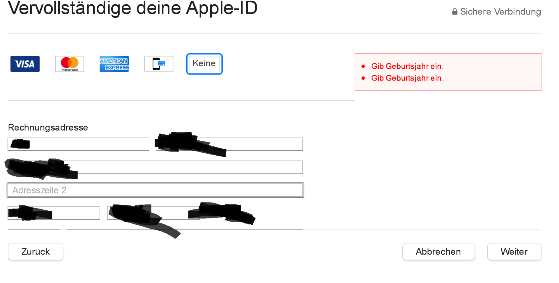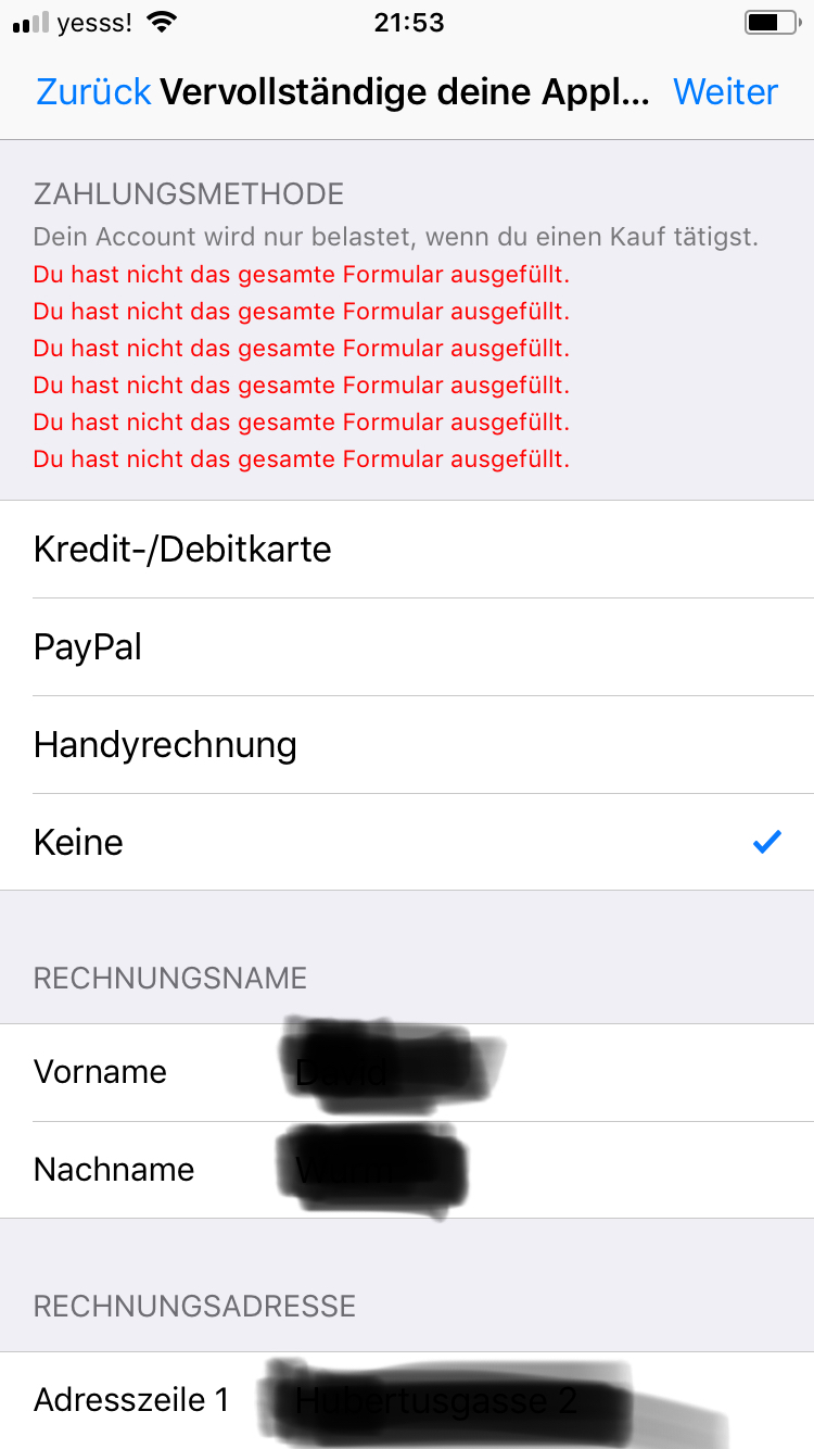 Hallo, Ich habe mir das IPhone 6s gekauft. Vorher hatte ich das 5er. Das neue Gerät möchte dass ich die Kontoeinstellungen meiner Apple ID eingebe. Wenn ich dies versuche wird mir jedoch mitgeteilt dass ich das Formular nicht komplett ausgefüllt habe, was ich jedoch getan habe. Mir wird auch kein Feld angezeigt in dem noch Daten fehlen, jedes Mal wenn ich also auf "weiter" klicke wird mir "Sie haben nicht das ganze Formular ausgefüllt" angezeigt, ohne dass mir ein Feld angezeigt wird, was denn fehlt... Ich kann also momentan nichts aus dem apple store herunterladen. Ich wäre sehr dankbar für Hilfe!
