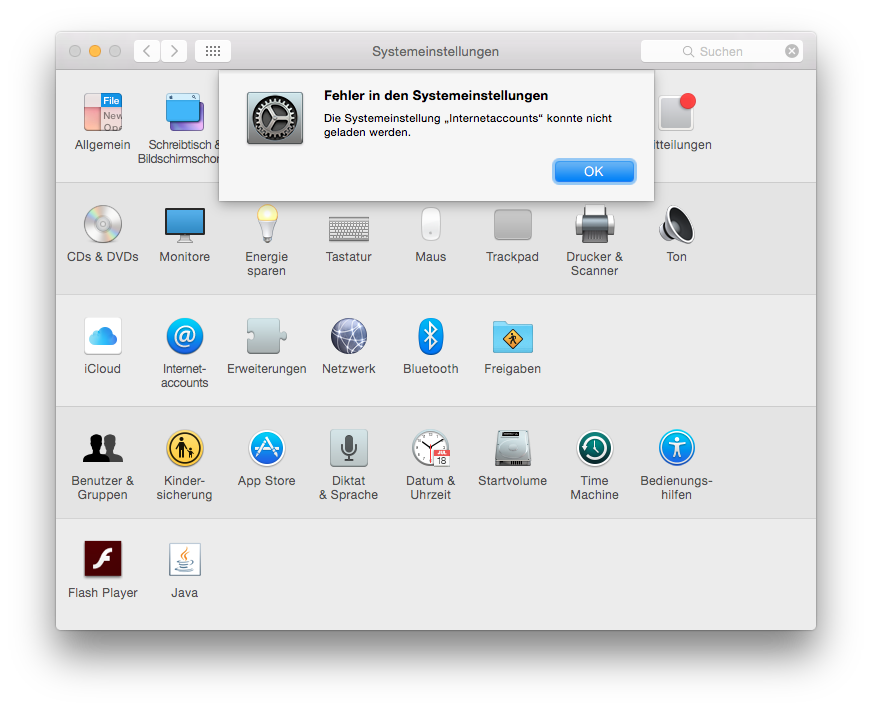 Bekomme immer die Nachricht Fehler in Systemeinstellungen "Internetaccounts kann nicht geladen werden".