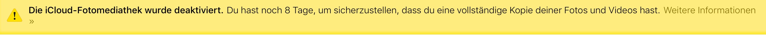 ich habe die iCloud Fotomediathek in der Fotos Anwendung auf dem Mac deaktiviert. Ich will das aber wieder aktivieren, habe auch genügend Speicherplatz. Jetzt steht aber dort, obwohl wieder aktiviert: "Die icloud Fotomediathek wir in x Tagen von iCloud gelöscht. Du kannst diesen Löschvorgang in den iCloud Einstellungen abbrechen."