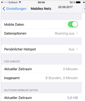 Bei den Klärungsversuchen gab es erstaunliche Erkenntnisse: iPhone 6plus (gleiche Erfahrungen mit iPhone 6 und iPad Air2) greift regelmäßig, den ganzen Tag über, aber auch fast regelmäßig nachts um 0:00 Uhr, in geringem Umfang (einige KB pro Tag) über "Mobile Daten" zu, obwohl ein einwandfrei funktionierendes WLAN zur Verfügung steht. Alle gängigen Vorsichtsmaßnahmen, um die Mobilfunknutzung zu minimieren, habe ich ergriffen, z. B. https://support.apple.com/de-de/ht201299, http://praxistipps.chip.de/datenvolumen-trotz-wlan-aufgebraucht-was-tun_39650 und https://support.apple.com/de-de/HT203124. Die Vorschläge, in den Flugmodus zu wechseln oder den Mobilfunk ganz auszuschalten, habe ich natürlich nicht befolgt, den das ist nicht zweckdienlich.