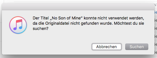 iTunes kann die verlinkte Originaldatei nicht finden und bietet dir an, dass du sie suchst. Die nicht gefundenen Originale werden in der Playlist mit dem Ausrufezeichen markiert.