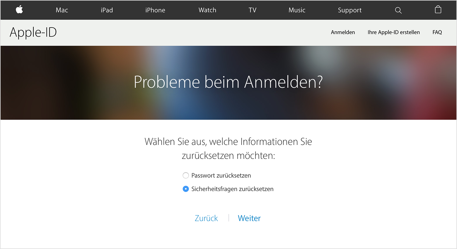 Bei Apple wird die Sicherheit Ihrer Daten sehr ernst genommen. Mithilfe von Sicherheitsfragen wollen wir sicherstellen, dass nur Sie auf Ihren Account zugreifen oder diesen ändern können. Wenn Sie die Antworten auf Ihre Sicherheitsfragen vergessen haben, verifizieren Sie mit folgenden Schritten Ihre Identität, und setzen Sie anschließend die Sicherheitsfragen zurück.