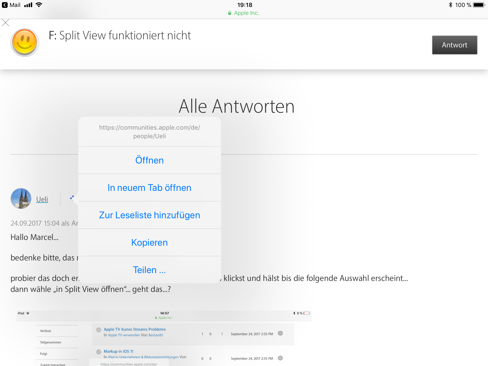 Die Funktion "Split View" wird vom iPad Pro, iPad (5. Generation), iPad Air 2 und vom iPad mini 4 unterstützt.“