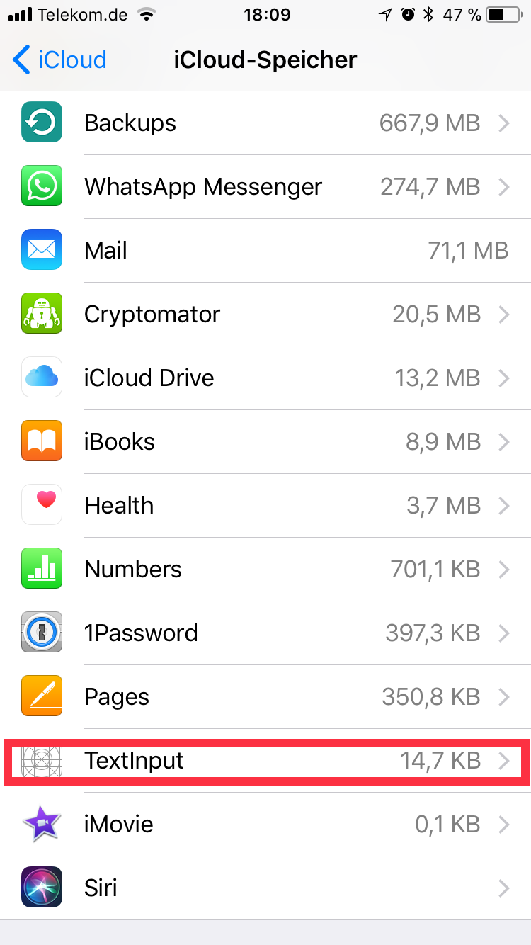 Ich habe TextInput aus dem iCloud-Speicher gelöscht.