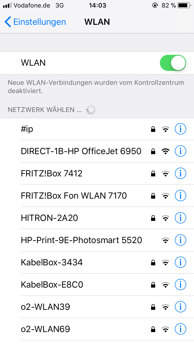 Jetzt sperre ich mein iPhone und nach dem Entsperren schaue ich in das Control Center. WLAN ist jetzt wieder blau und Status „suchen“.. es sucht die ganze Zeit, verbindet sich aber nicht, obwohl das Netzwerk in Reichweite ist.