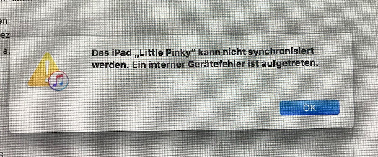 seit kurzer Zeit habe ich mit meinem iPad Air das Problem, dass die Synchronisation von Fotos mit einer Fehlermeldung abbricht. Ich habe schon alle Bilder und Alben vom iPad gelöscht und versucht sie neu zu synchronisieren. Manchmal bricht die Synchronisierung auch ohne Fehlermeldung ab und erst beim 2. Versuch kommt dann die Fehlermeldung. Das iPad hängt mit original Apple Lightningkabel direkt am Mac Mini (2012) mit letztem macOS Sierra.
