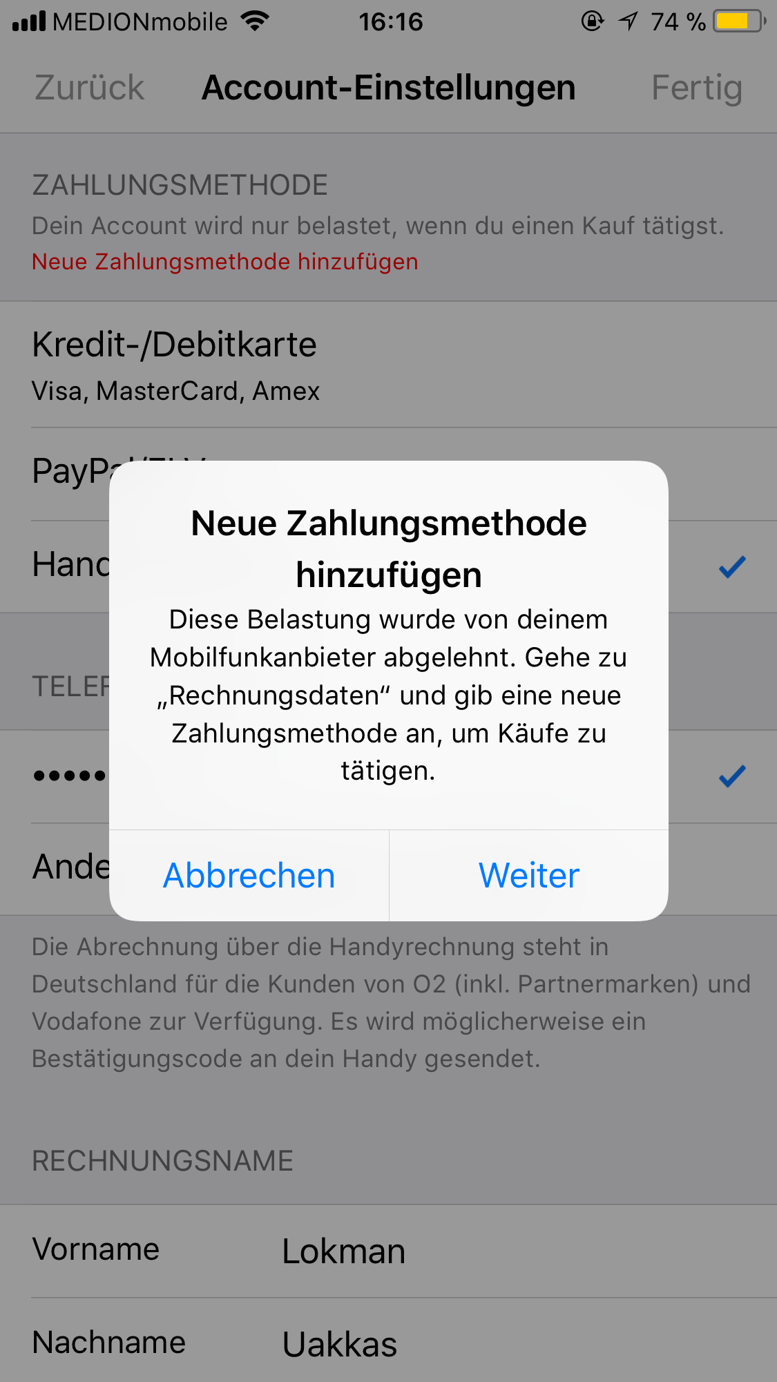 Im Monat September gab es Probleme mit der Handyrechnung dieses habe ich dann aber am 02.10.17 beglichen ( in der Rechnung sind ja auch die Drittanbieterzahlungen wie zB. Apple Store ) mit eingerechnet . Nun habe ich mich an meinem Mobilfunkbetreiber O2 gemeldet , dort ist keine Sperre vorhanden und diese haben mich dann direkt mit Apple verbunden . Dieser meinte zu mir , dass es Probleme mit der letzten Zahlung gab und deshalb eine Sperre drin ist ; auch sagte er mir es ist noch ein offener Betrag von 6,71 € vorhanden . Aber meine Frage ist wie soll das den funktionieren wenn ich doch die Rechnung bezahlt habe ?! Wohin soll ich den jetzt den offenen Betrag hinüberweisen ?! Kann nicht mal Updates laden ... Es nervt mich nur noch alles ...