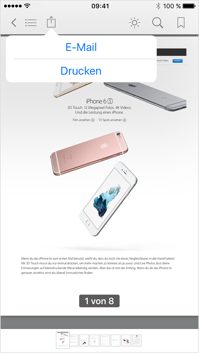 - Drucken: Wählen Sie einen AirPrint-Drucker, den Seitenbereich und die Anzahl der Exemplare aus. Tippen Sie dann auf "Drucken".