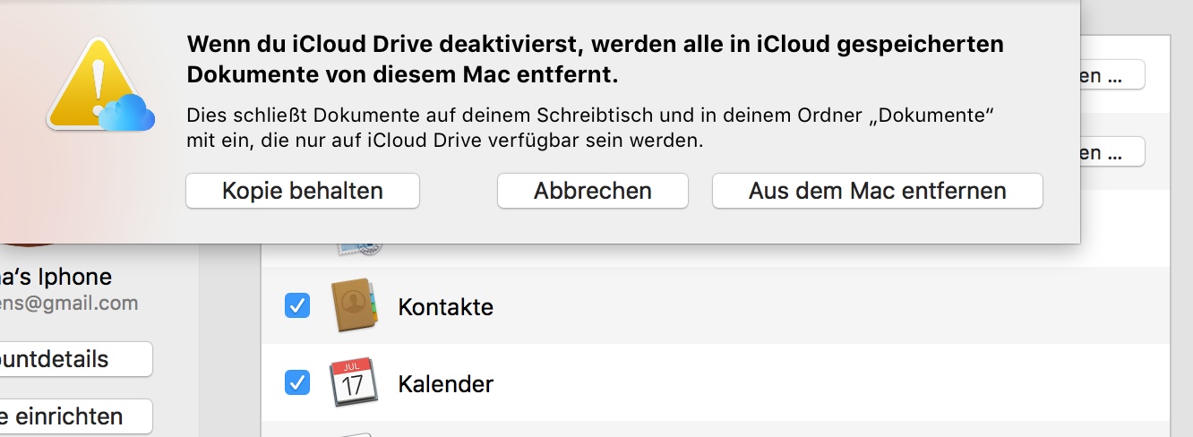 Hier muss sicherheitshalber Kopie behalten geklickt werden. Vermutlich hast du dann die Dateien doppelt auf dem Mac, einmal wie früher unter dem Benutzerordner, und einmal unter dem iCloud Drive Ordner beim Mac, hier ist dann ein zusätzlicher Ordner mit iCloud Drive (Archiv) erstellt worden. Die Kopie von den Daten kann gelöscht oder auch verschoben wären.