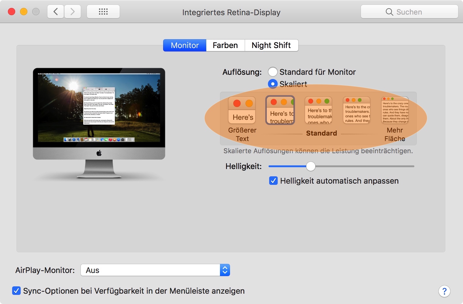 Dort in das Menü für Monitore, vermutlich ist bei Euch auf der rechten Seite das mittlere Kästchen, direkt über dem Begriff Standard voreingestellt.