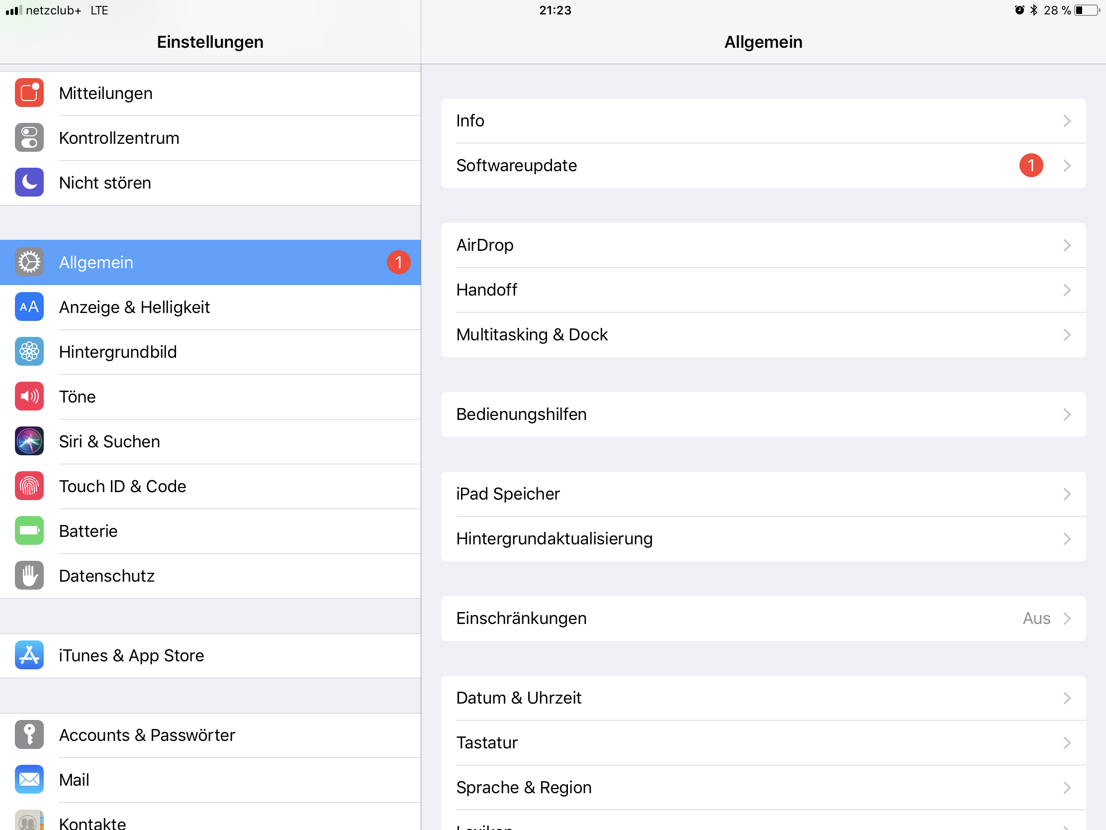Bei meinem iPad Pro (10.5 Zoll) werde ich, bei den Einstellungen, mit einer roten eins auf ein Softwareupdate hingewiesen.