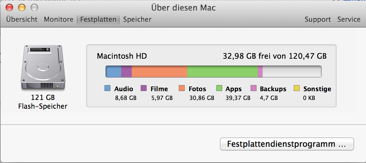 Was kann ich tun, wenn mein OS X 10.9.5 Betriebssystem beim Volume voll anzeigt und 34 GB vorhanden sind?