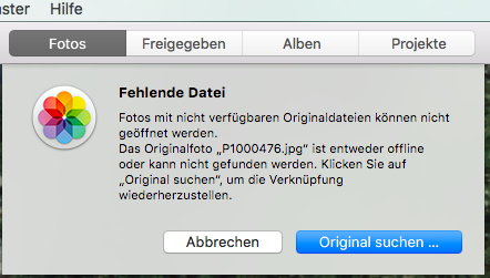 Habe in meiner Fotomediathek sehr viele Fotos gefunden, bei denen beim Betrachten (Vorschaufunktion) die Fehlermeldung kommt, dass die Originaldatei nicht gefunden werden konnte. Die Fotos werden zwar angezeigt, aber in reduzierter Auflösung (fällt erst beim hereinzoomen auf). Eventuell habe ich damals Fehler beim Importieren gemacht. Ich bilde mir ein, das war beim Wechsel von iPhoto auf die Foto-App.