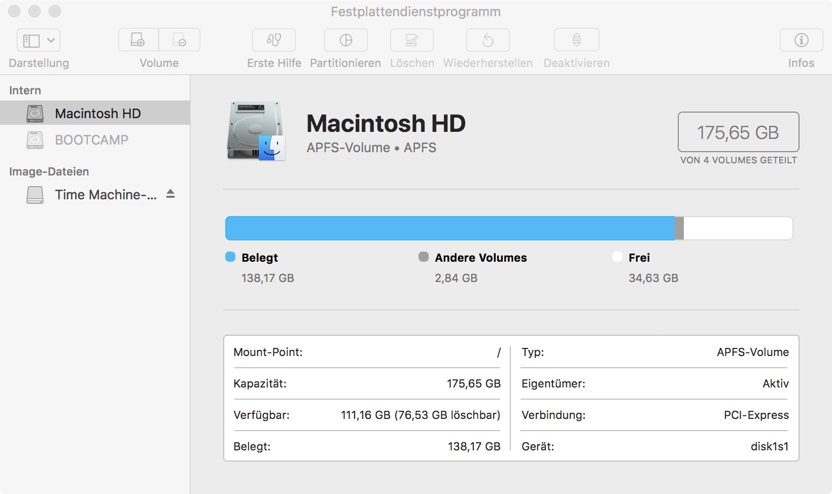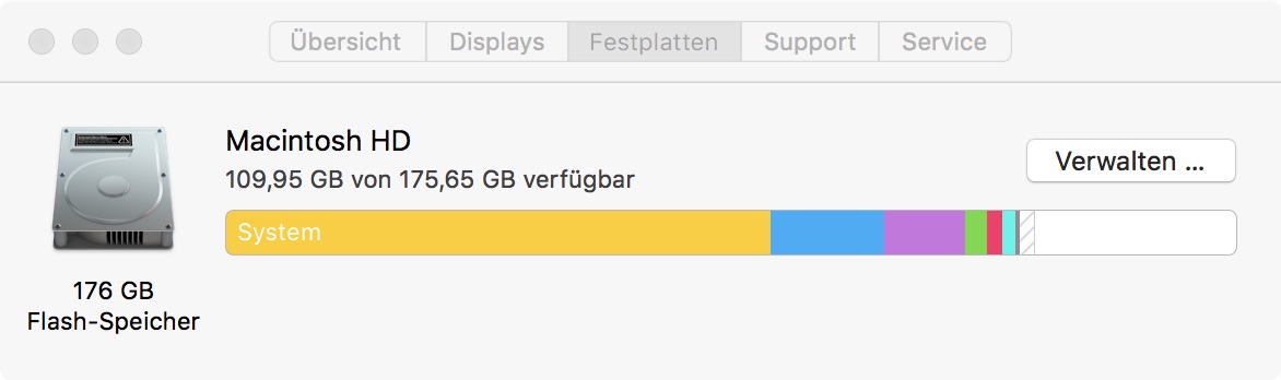 Aktuell habe ich die Platte für Boot Camp partioniert, so dass dem macOS noch 176 GB zur Verfügung stehen. Leider lassen sich davon 80 GB aus unerfindlichen Gründen nicht nutzen.