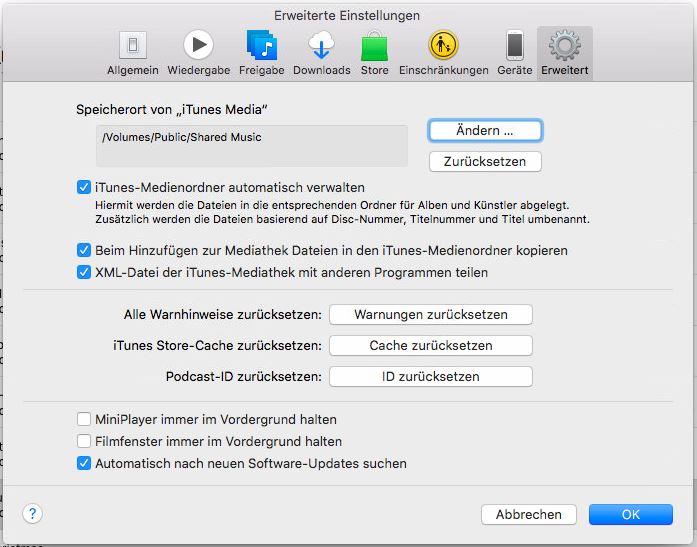 Dann solltest du vorerst die Unterordner mit den Dateien aus iTunes auf dem Mac in einen anderen Ordner verschieben und umbenennen. Dann machst du das gleiche mit den anderen Dateien auf deiner externen Festplatte. Danach startest du iTunes neu und passt die Einstellungen an. iTunes wird darauf hin alle Dateien der Festplatte scannen. Dann iTunes wieder über das Menü beenden.