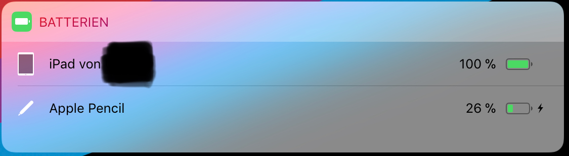 Habe ich schon versucht, aber er zeigt mir das auf deinem Foto so gar nicht an. der Batteriestatus ist der vom iPad , der re. oben auf dem Displays angezeigt wird . Unter „Einstellungen „ wird der Pencil nicht angezeigt....