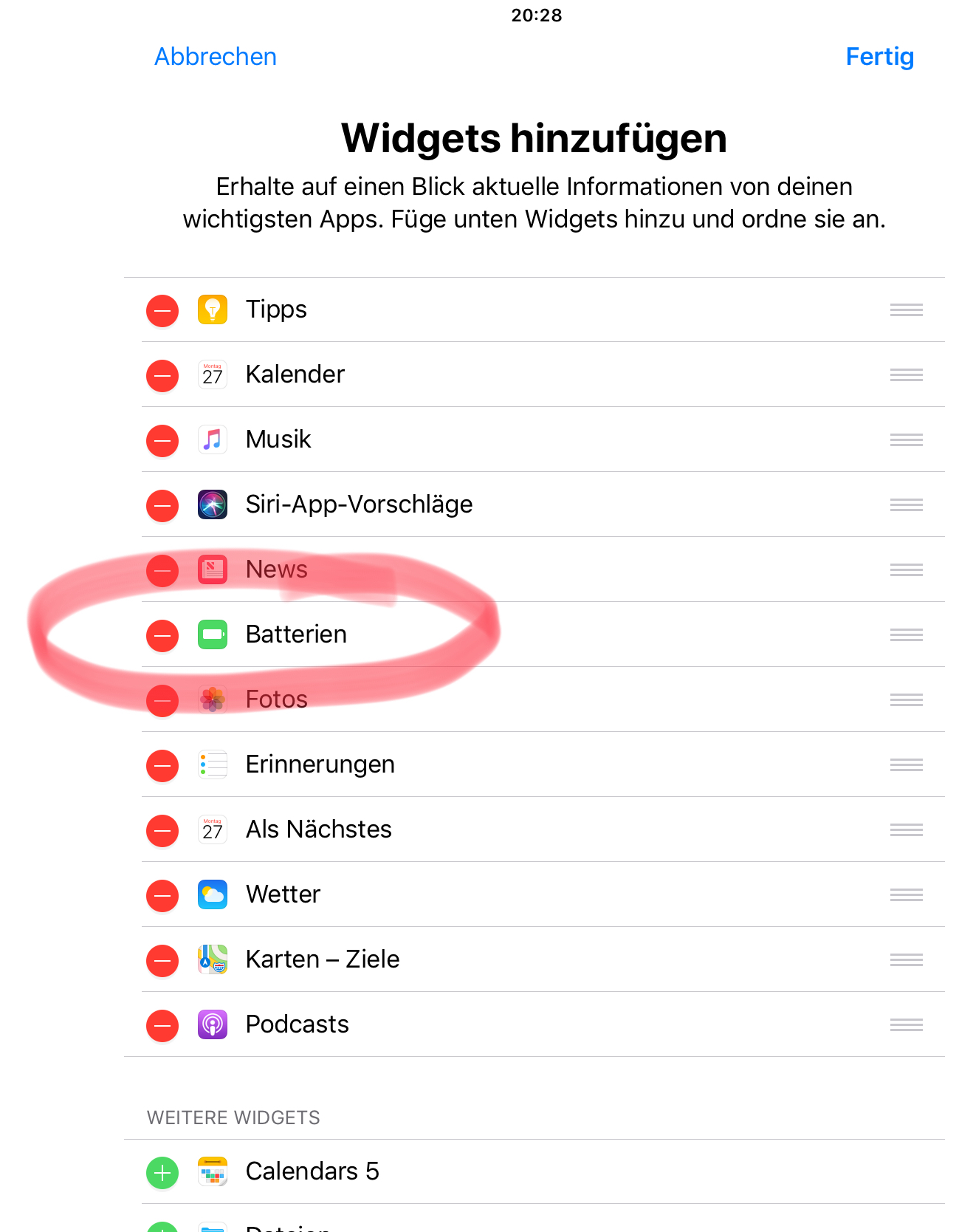 Also vom Homescreen Wisch nach rechts... Batterien