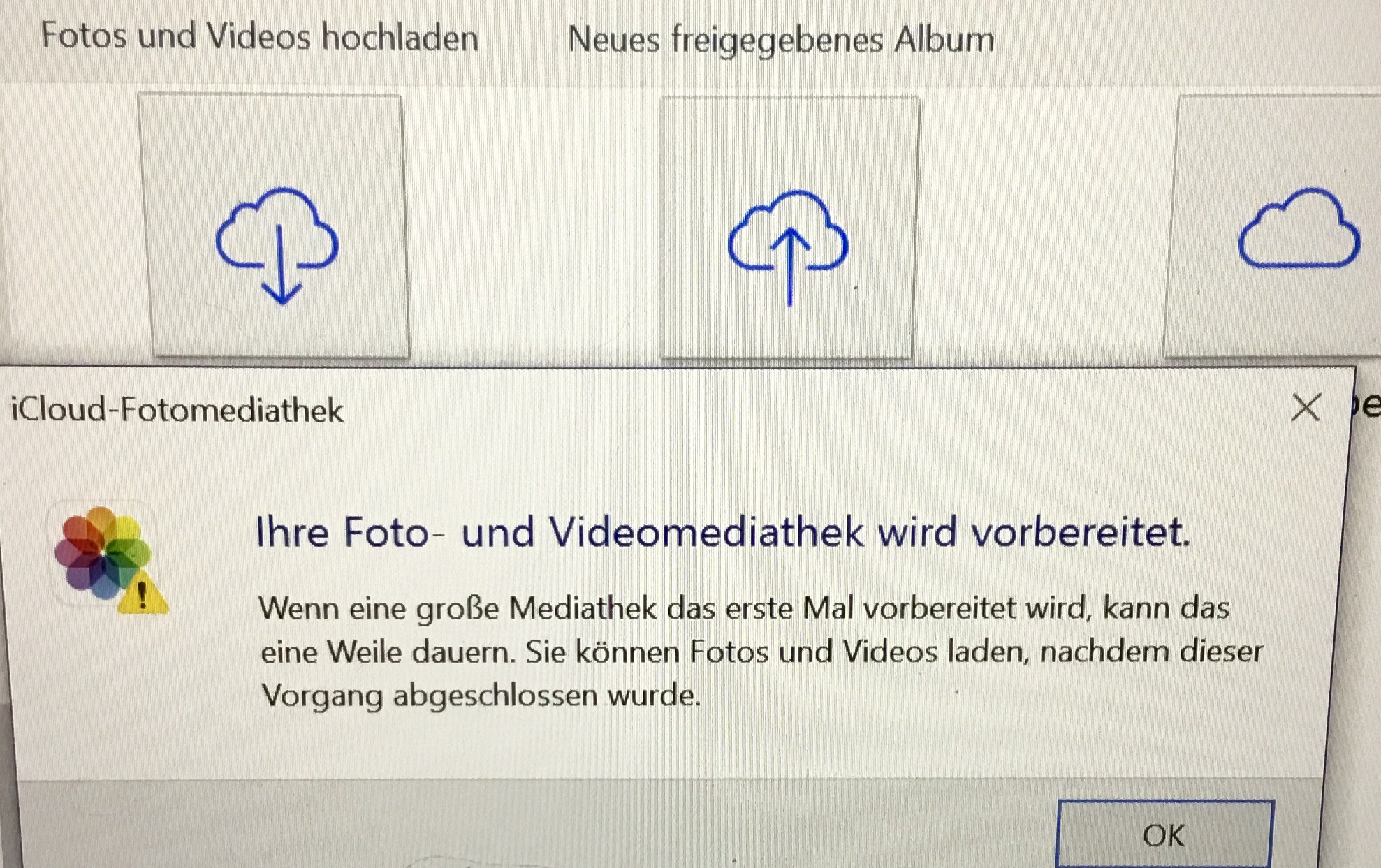 ich habe iCloud auf einem neuem Windows 10 PC eingerichtet - iCloud Drive funktioniert - Fotomediathek bringt beim Versuch Fotos zu laden nur die Fehlermeldung „Mediathek wird vorbereitet“!