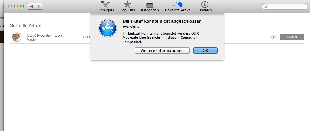 Dein Kauf konnte nicht abgeschlossen werden. Ihr Einkauf konnte nicht beendet werden. OS X Mountain Lion ist nicht mit diesem Computer kompatibel.