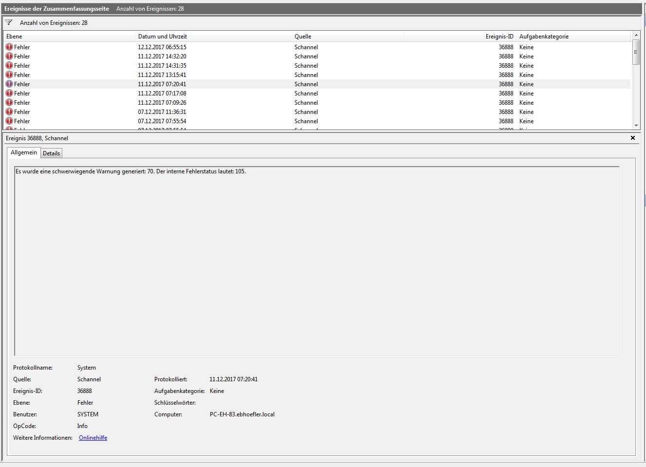 Am 07.12.2017 habe ich auf die neue iTunes Version 12.7.2.58 auf meinem Firmenrechner upgedatet. Vorher hatte ich die Version 12.7.1.14. Seit dem Update erscheint bei mir in der Ereignisanzeige der Fehler "Ereignis 36888, Schannel / Es wurde eine schwerwiegende Warnung generiert: 70. Der interne Fehlerstatus lautet: 105". Auch zu Hause habe ich das Update eingespielt. Dachte zunächst, dass es an meinem neuen iPhone X liegt. Habe dann zu Hause ein Backup meiner Festplatte zurückgespielt. Hier hatte ich noch die Version 12.7.1.14. Und siehe da, hier entsteht der Fehler nicht. Die Ereignisanzeige generiert diese Meldung, sobald man iTunes startet. Es hat nichts mit dem Anschluss irgendwelcher Geräte zu tun. Der Fehler ist reproduzierbar. Sobald ich auf die Version 12.7.2.58 update habe ich diesen Fehler. Zurück auf die Version 12.7.1.14 und der Fehler ist weg. Ich nutze auf beiden Rechnern Windows 7 Professional (64 Bit).